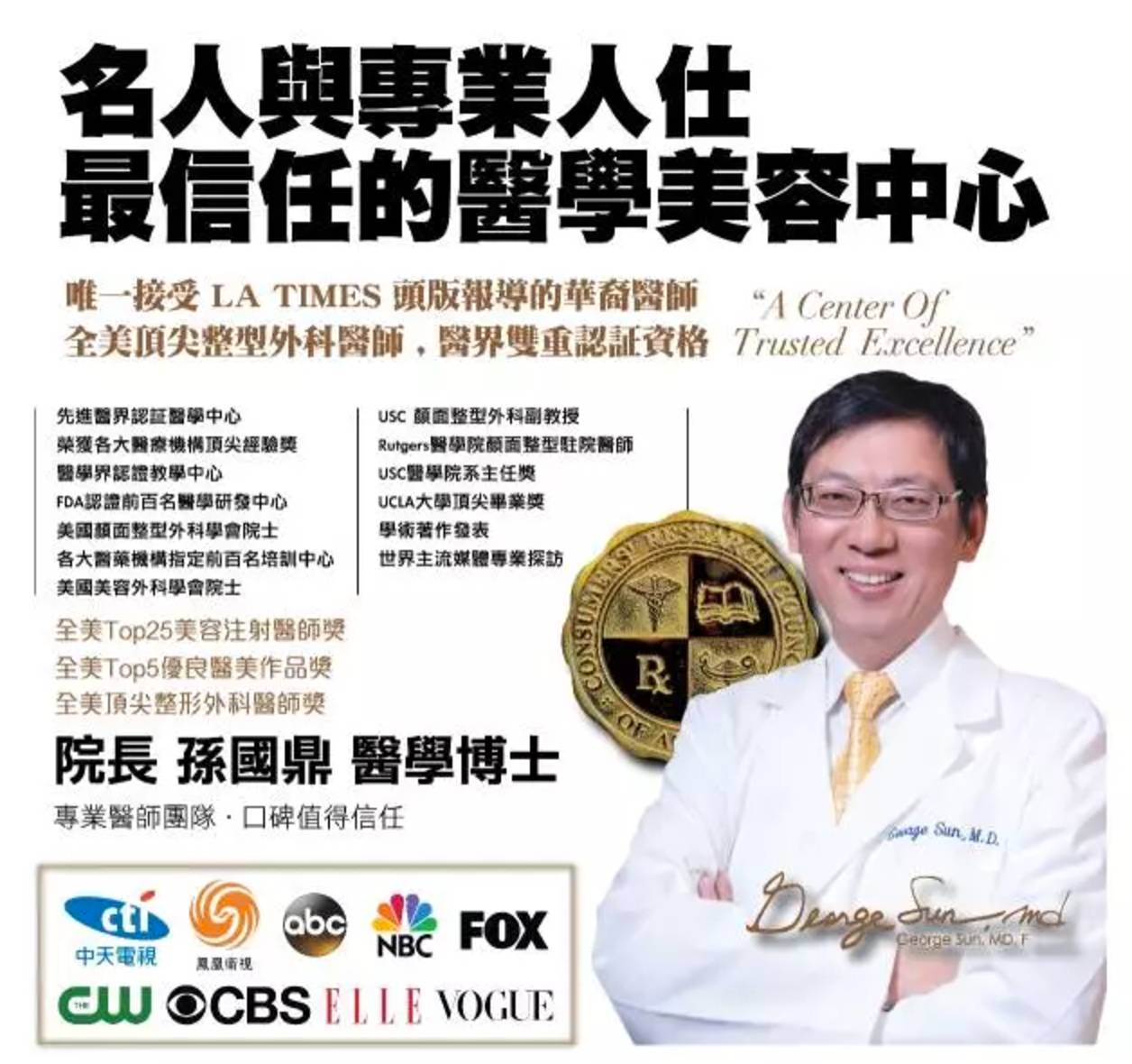 名人最信任的美容中心,是您最佳選擇,由榮獲全美頂尖整形外科醫師榮譽的孫國鼎醫學博士主持