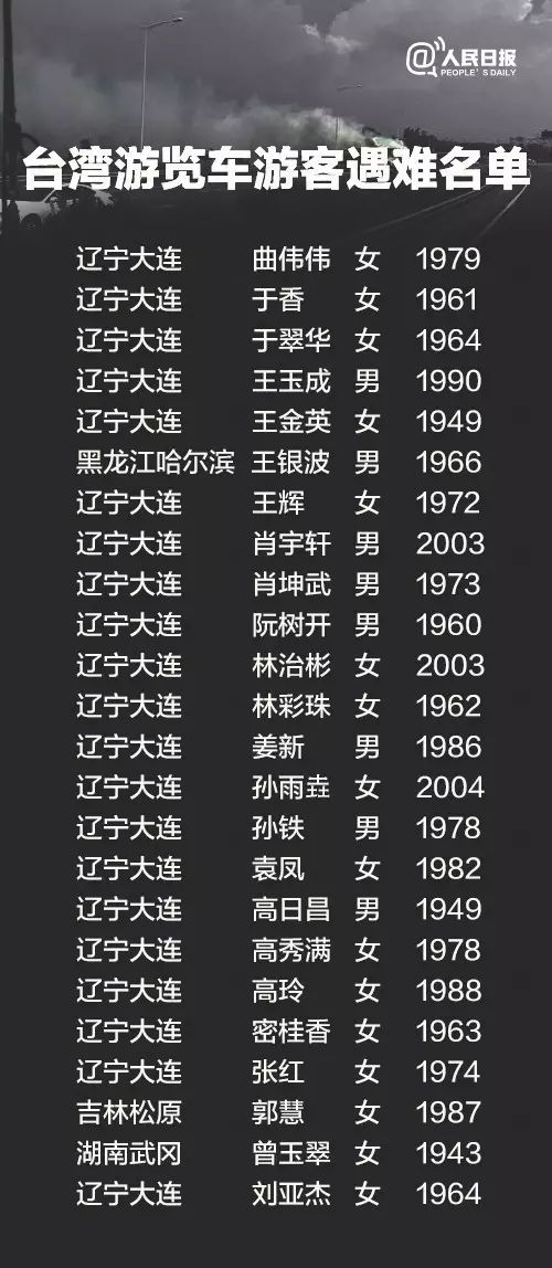 台湾消防署表示,车上是辽宁省大连市24人(8男16女)旅行团,另有导游1人(男性)、台湾司机1人(男性),年龄最小者仅12岁,年纪最大的73岁。自本月12日入台8日游,由高雄巨龙旅行社承办,原预计19日下午16:30搭机返大连,没想到前往机场途中出意外。