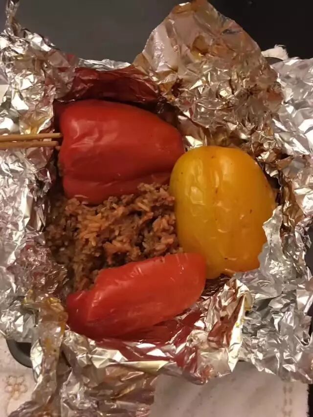 這個是朋友瘋狂安利的,彩椒裏裝著米飯和牛肉,有cheese 的味道但是不重,所以不會特別膩,微辣特別好吃,做起來很方便,用烤箱烤一會就好~