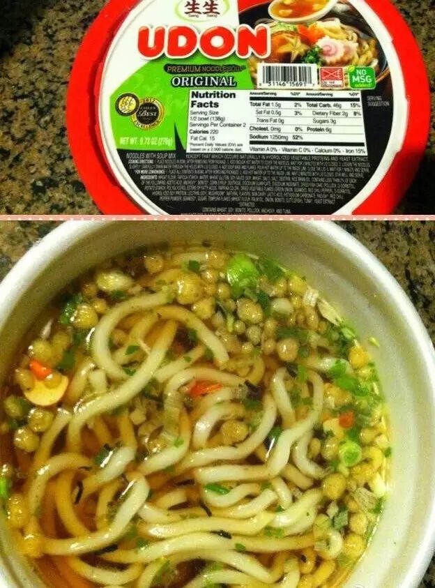 烏冬面一箱有六盒,如果遇上打折10刀左右可以買一箱。每一碗裏面配有蔬菜包和醬油包,先把開水將烏冬面悶上幾分鍾,將水倒掉,再加入開水,放入料包就可以享用啦,不要五分鍾就能吃上一碗熱騰騰的烏冬面,湯料純鮮微甜。