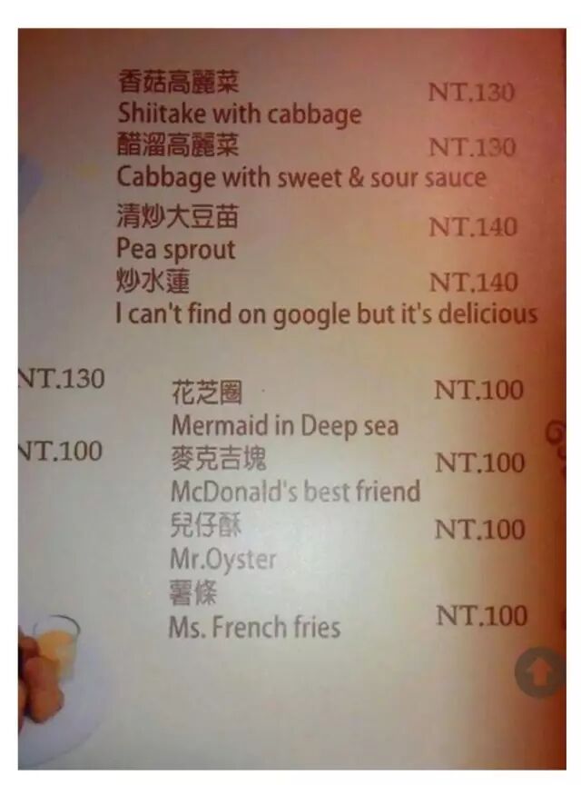借热播电影名翻译中文菜品,让外国人心领神会,的确非常巧妙。但在很多情况下,一些菜单上的菜名翻译让人大(ren)开(jun)眼(bu)界(jin),更有一些菜肴的名称让外国朋友吓Cry。甚至有实诚的老板直接注明:我不会翻译,但总之很好吃就对了。