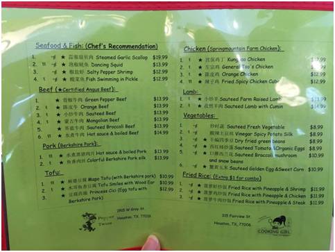 这家餐厅位于休斯顿(Houston, TX 77019 River Oaks, Montrose),是以川菜为主的中式餐馆。