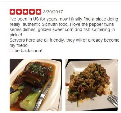 网友:我在美国待了不少年了,这是我发现的真正正宗的川菜。服务员们也很友好,他们已经成为我的朋友,我很快就会再回来品尝的。