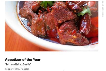 近日,美国《GQ》杂志发布了餐饮品赏大师Brett Martin最新出炉的“美国2017餐饮排行榜”,位于休斯敦的Pepper Twins双椒川菜馆的招牌凉菜“夫妻肺片”荣登榜首,被评选为“年度开胃菜”(Appetizer of the Year)。