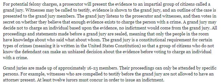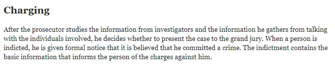 如果涉及所谓的重罪,检方会将证据递交给大陪审团(Grand Juries),大陪审团会以秘密投票形式,决定根据这些证据,是否能以该指控的罪名起诉嫌疑人。