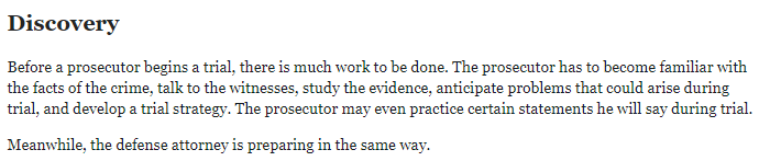之后便开始起诉方举证,出示物证和传唤证人出庭作证。起诉方先进行直接询问,之后再由辩方律师发文,交叉询问,暴露证人作证的缺陷和不足,最终再由起诉方询问重建证据可信度,对证词中的模糊之处予以澄清。