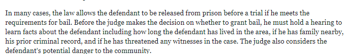 大多数情况下,法官会通过传讯获得的信息,例如嫌疑人未来在该地区居住时间,以前的犯罪记录和是否威胁目击者,以及嫌疑人对社会可能造成的危害等等,决定是否予以其取保候审权力,
