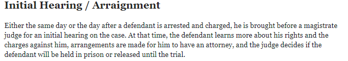 美国法律规定,在嫌疑人被逮捕的当天,或是第二天,将会带到庭上,地方法官将针对该案件,进行第一次聆讯。犯罪嫌疑人会被告知自身的权益,包括大家熟悉的“米兰达警告”,和犯罪嫌疑人面临的指控,以及决定嫌疑人是否被继续羁押,或是取保候审。