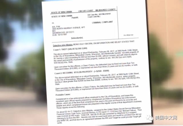 威斯康辛大学密尔沃基分校中国籍留学生夏帆(Fan Xia,音译)因涉嫌倒卖盗窃商店礼品卡并出售给中国买家,赚取利益37,000美元,被控一项重罪盗窃罪和一项盗窃财物罪名被警方起诉,保释金3万。