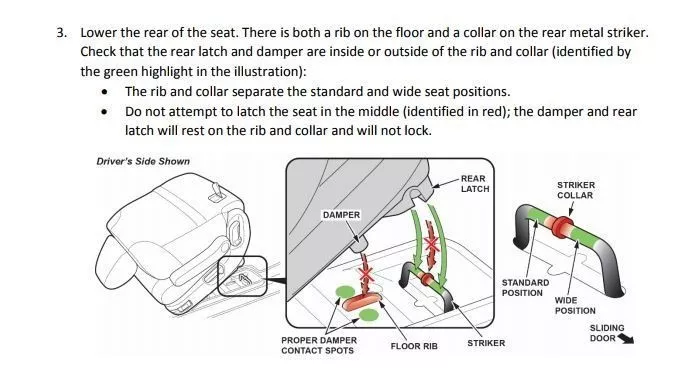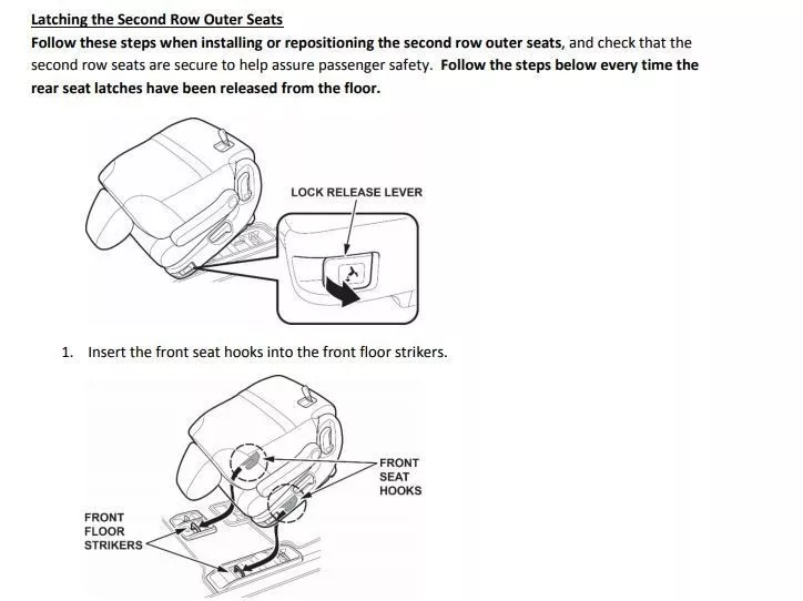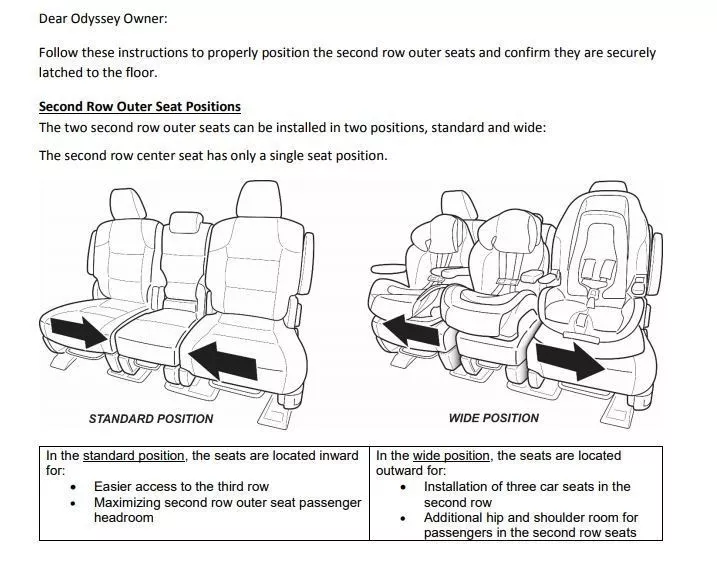 据说奥德赛的第二排座椅可能在急刹车时会向前倾斜,大大增加了乘员受伤的风险。如果在后侧边调整或重新安装一个被拆卸的座位后,它就会被适当地锁住。