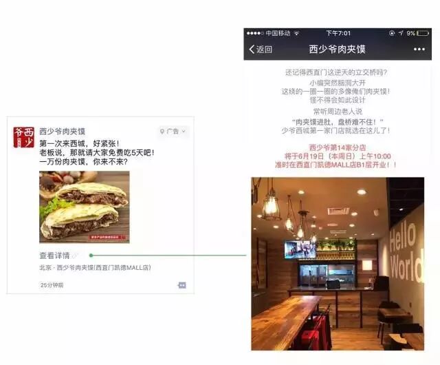 西少爷肉夹馍西直门店,为提高新店的曝光率和到店消费人数,西少爷开展了“免费吃5天肉夹馍”活动并选择投放朋友圈本地推广广告。