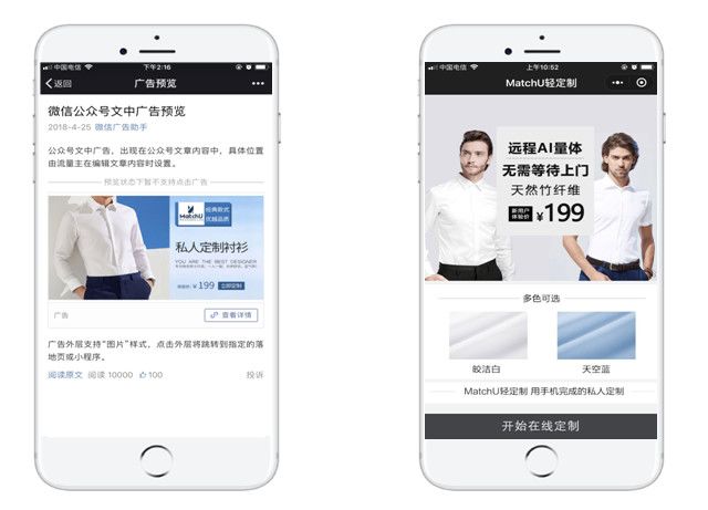 MatchU小程序与微信广告服务商微盟进行了一次成功合作,在公众号文中广告+小程序构成的内容电商,为了保证广告在推文中出现,既醒目又不突兀,MatchU在素材上选择高质量单品,以经典白衬衫穿搭吸引消费者目光,“专为商务男士打造,私人定制衬衫,体验价199”用高性价比引导用户查看详情。用户点击进入小程序,就可直接在线完成定制-购买,最终这波推广为MatchU带来了300万+的曝光。