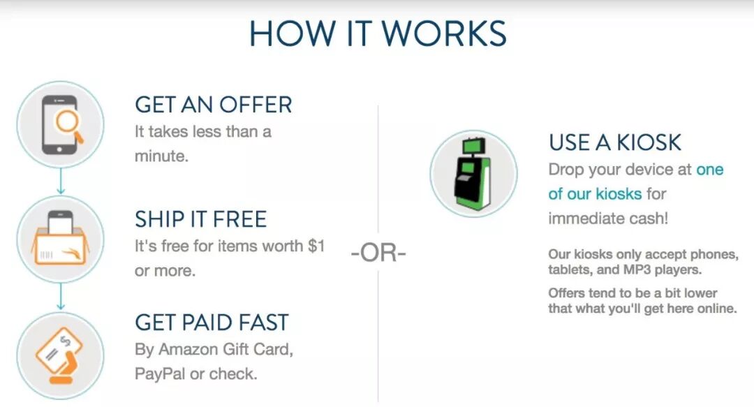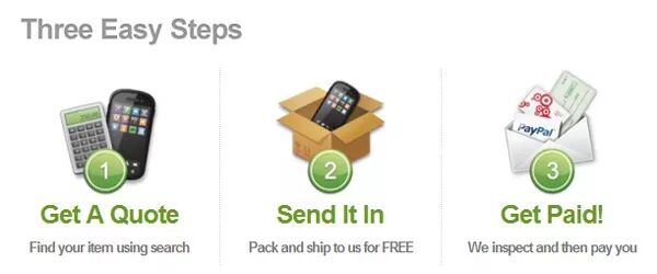 美国最大的二手电子产品买卖平台之一。在其官网上输入你的闲置产品信息,得到报价决定出售之后,Gazelle会给卖家寄一个预付邮费的盒子。卖家在30天之内把要出售的设备寄给Gazelle即可。Gazelle收到代售的产品后会进行非常严格的审核,有专业的软件检测设备的型号以及是否是盗窃的产品等等。通过检测之后,卖家就能收到报酬了,可以选择Amazon Gift Card、Paypal或者支票。