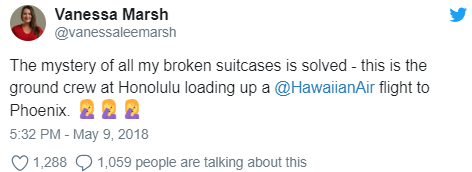Kristen不是第一個被航空虐行李的乘客,不到一個月前,就有乘客在夏威夷檀香山國際機場拍到工作人員粗暴對待乘客行李的視頻。拍下這段視頻的推特用戶Vanessa Marsh說,自己行李箱總是破掉的千古懸案,今天算是破了。