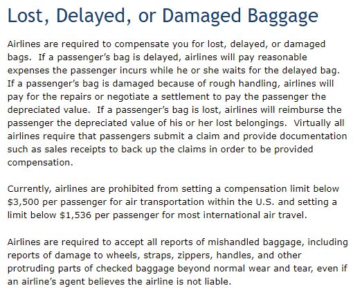 賠付金額:延誤3或6小時(當前是3小時,7月末開始要求6小時)每天賠償最高 $100 最多 5 天,行李丟失最高賠償 $3,000