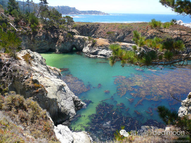 从Carmel往南开3.5英里(5.6公里)就到Point Lobos州立保护区(收费每车10美元)。 它占地550英亩(220公顷),包括很多沿海地貌如海湾,海岬,草甸,潮汐池。