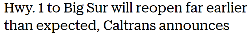 加州运输局表示,因为最近的天气非常配合,再加上施工队的高效率,原定于9月的重新开放,被提前到了7月底。