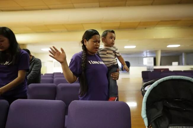 丈夫面临遣返的一名妇女,抱着儿子在俄亥俄州一所教会祷告。