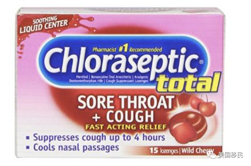 这款常用药中,含有咽喉疼痛可用表面麻醉药 Dyclonine 达克罗宁和 Phenol 苯酚成分能快速缓解喉咙痛、口腔疼痛,抑制咳嗽长达4小时并冷却鼻腔通道。因为是野樱桃味,口感也不错。