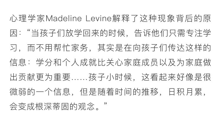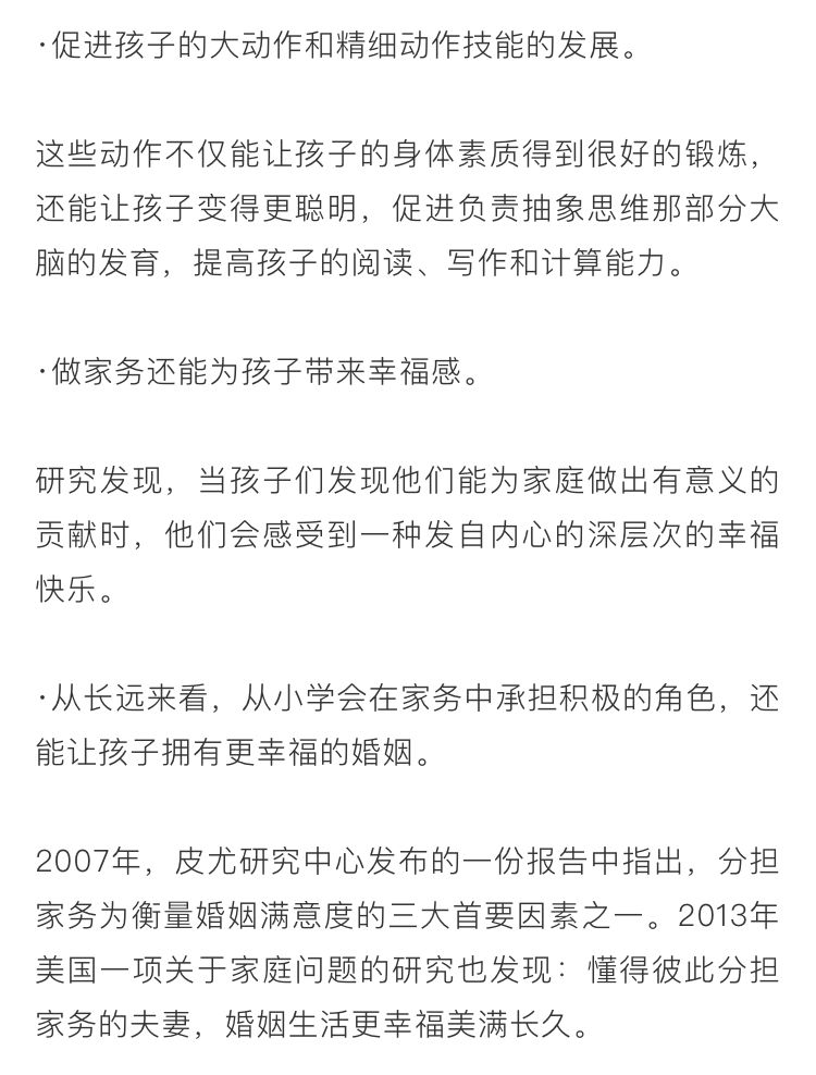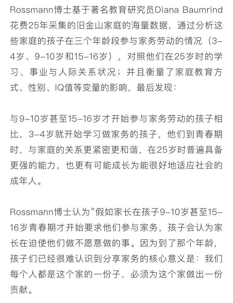 2002年,明尼苏达大学专攻家庭教育研究的教授Marty Rossmann发表了一项震撼教育界的研究成果:家长通过鼓励孩子参与家务劳动,就能对孩子的未来施以极为重要的积极影响——培养孩子的责任感,让他们学会设身处地为他人着想,并习得关爱他人的同理心。