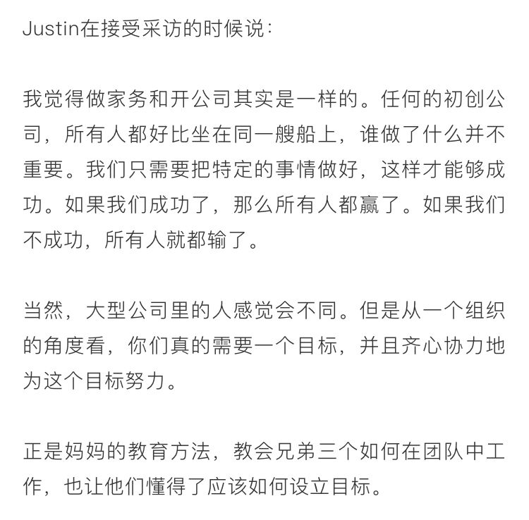 在接受媒体采访的时候,儿子们告诉大家:是妈妈的“家务教育法”让他们学会了如何创办和管理公司。