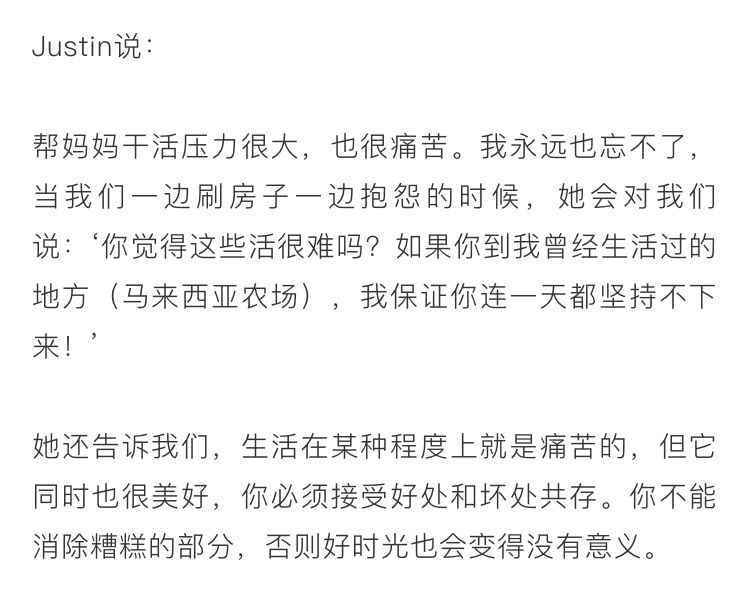 Justin说:“我们都觉得这样很不公平,但重要的是做家务确实教会了我们很多东西。它让我们从‘只考虑自己’变成了‘了解我们的责任’,也让我们意识到自己是一个团队。”