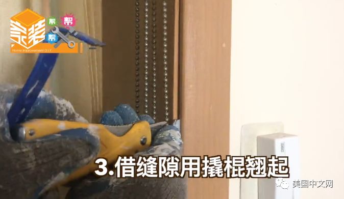 先用平头刀在钉子位置松动边框。边框上面的小白点表示钉子的位置。翘开一点缝隙之后,用撬棍用力翘起。另一边也是一样的。