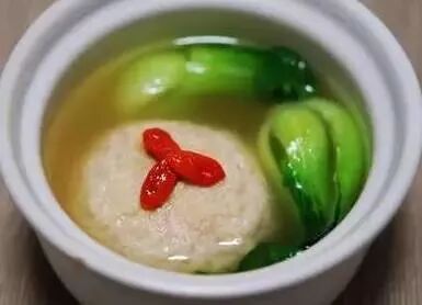 ✦取一砂煲,放入高汤,肉糜捏成团,轻轻放入。然后大火烧开,撇去浮沫。加盐调味。小火炖15分钟。放入青菜,烧开即可。