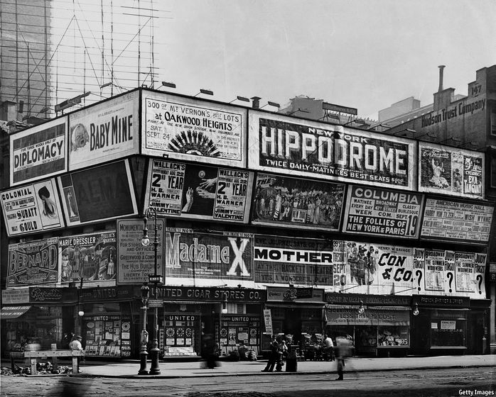 当行人漫步在曼哈顿中城八大道位于地狱厨房这一段,会被赫斯特杂志集团大楼(Hearst Magazine Building)的混凝土石灰石外立面震撼。这栋大楼由威廉·伦道夫·赫斯特(William Randolph Hearst)于1926年委托设计,3716平方米的装饰艺术风格建筑带有凹槽柱和雕像。在它上面是一栋183米高的玻璃和钢结构大厦。它的另一个突出特点是一块巨型数字屏幕,不断播放着来自BuzzFeed、ESPN和Vice的广告。这种历史与现代的混合是户外广告业务本身的典型特征。尽管这种广告是世界上最古老的营销形式之一,但它正在拥抱数字技术。