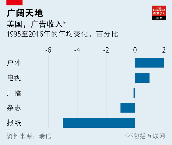 多年来,印刷、广播和无线电视等大多数传统广告形式面对网络广告的兴起节节败退,只有可追溯至19世纪的广告牌以及有线电视广告仍然坚守阵地(见图表)。户外广告(OOH)预计将在2018年增长3.4%,而包括机场和购物中心液晶显示屏在内的数字户外广告(DOOH)将增长16%。这类广告把受众注意力从手机上吸引过来,而且不能像网络广告那样可被跳过或屏蔽。