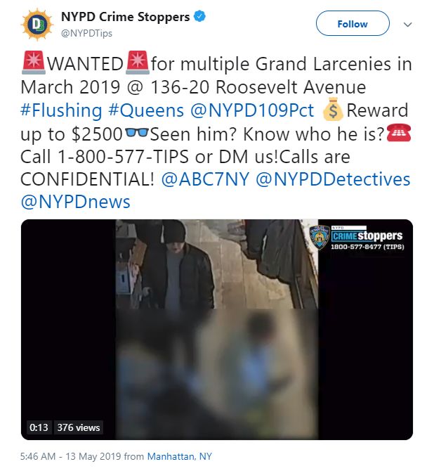 当地时间5月13号,警方发布推文称新世界超市内有一名小偷,偷走了顾客放在手推车上的包包。
