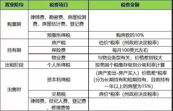 在美国,买房、持有房屋、出租房屋、出售房屋时,都会涉及到税费,具体如下表所示: