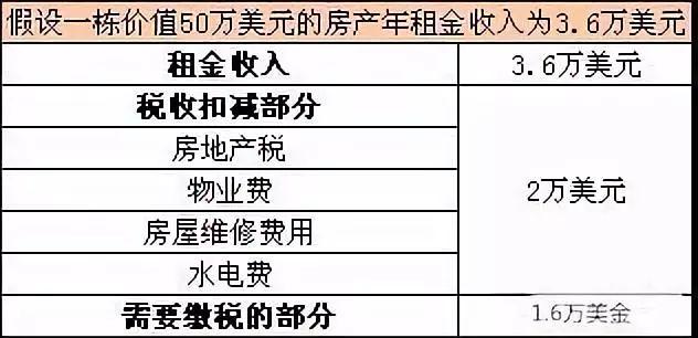 假设一栋价值50万美金的房产,一年的租金收入有3万6千美金,扣除物业费,房地产税,基本维修,水电费,及折旧共2万美金,则此出租房产净收入为1万6千美金,符合10% 及15%两段等级税率,需缴纳的个人所得税为: