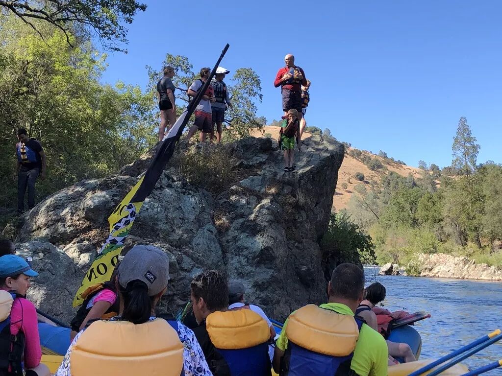 我以为漂流已经够惊险,结果等我们划到一处岩石旁时,教练却示意我们靠岸。原来这是一个跳崖处,一帮家长带着孩子站在岩石上,准备往下跳。