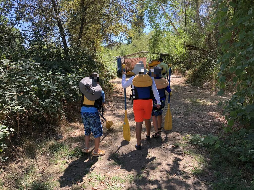 到了目的地,简单收拾一下后就开始穿上救生衣,每人发一个浆,往河边走。