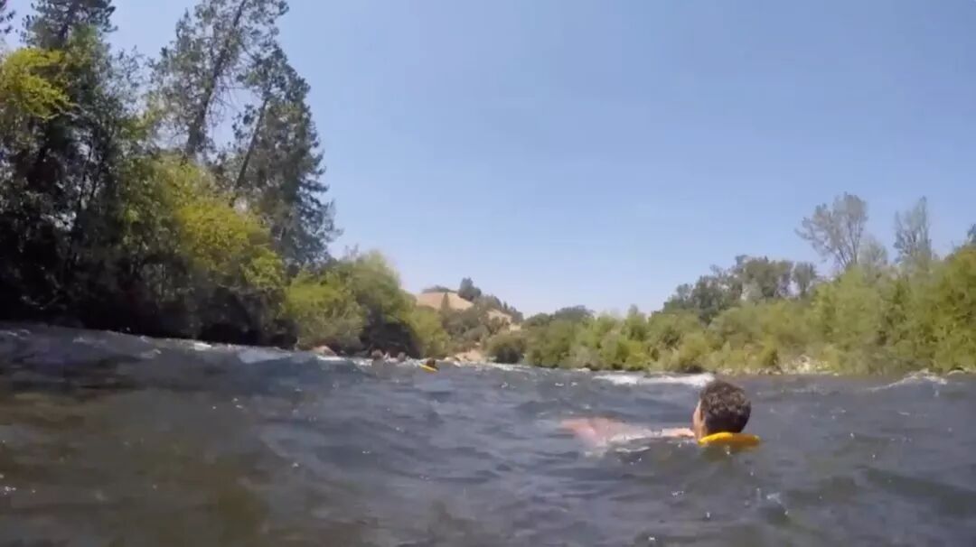 水还是挺深的,他们一点都不害怕,在水面上嘻哈打闹的,靠着救生衣护体,直接漂在水面上往下游滑,爸爸在前面冲,孩子就在后面跟着,毫无惧色!