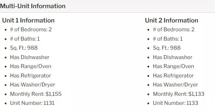 房产上市时,两户房子都有租客在租,租金分别是1155美金和1133美金。