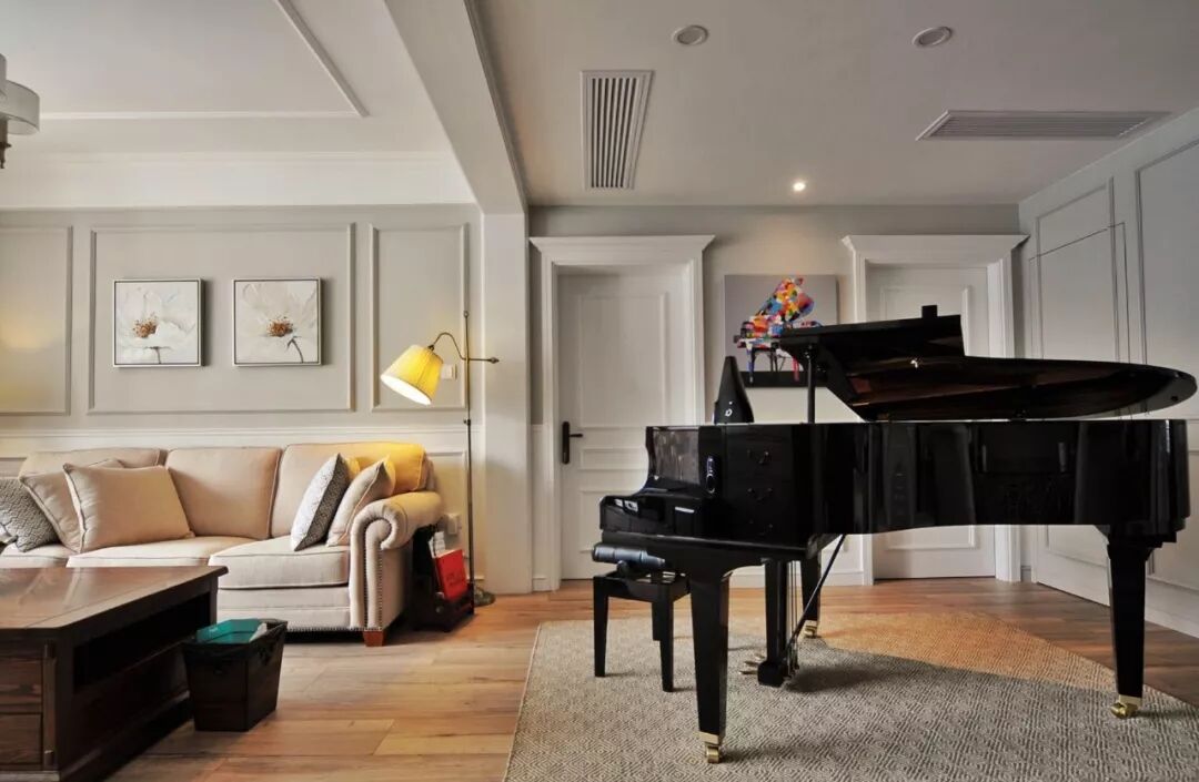 点评:客厅放这么大一架三角钢琴,一看就是艺术家庭,立面以线条、护墙板、壁纸为主,很美式,家具造型选择相对比较传统。