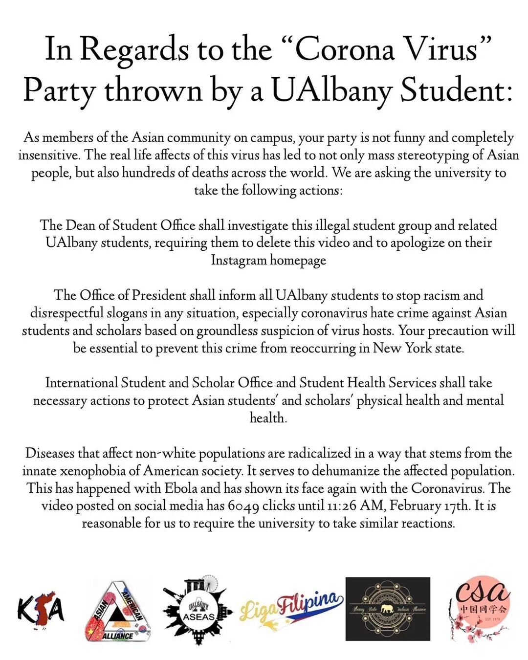 位于奥本尼的纽约州立大学2月21日周四证实,该校正在调查一起以新型冠状病毒为主题的校外派对是否违反了该校的学生行为准则。