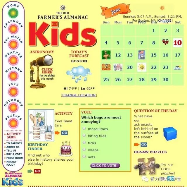 The Farmer’s Almanac for Kids(农历儿童版)是美国专业、权威的农业、气象杂志的儿童版本。你的孩子有多少次听到“农历”这个词汇但是并不知道其中的含义了?不要以为凡是涉农的知识就没用。其实不然,对孩子来说,气象知识是非常实用的生活常识,在美国是每个小学生都需要了解。但是在国内这个部分就比较少涉及了。