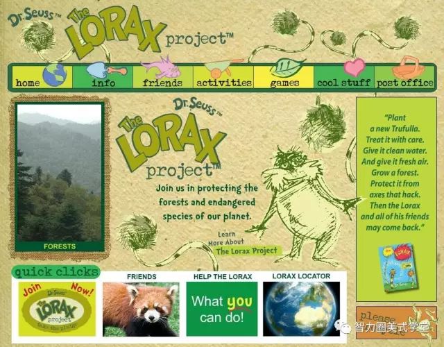Lorax是苏斯博士笔下的一个经典形象,原版绘本也是受到全世界孩子喜欢,因此还被改编成了同名电影。这个网站是苏斯博士官方中的一个栏目,以Lorax的故事为背景,插入了一些关于动植物的科学知识,以此来培养孩子热爱自然、保护环境的意识。另外以Lorax为背景的活动、游戏和信息也让这个网站成为孩子们的绝佳学习资源。