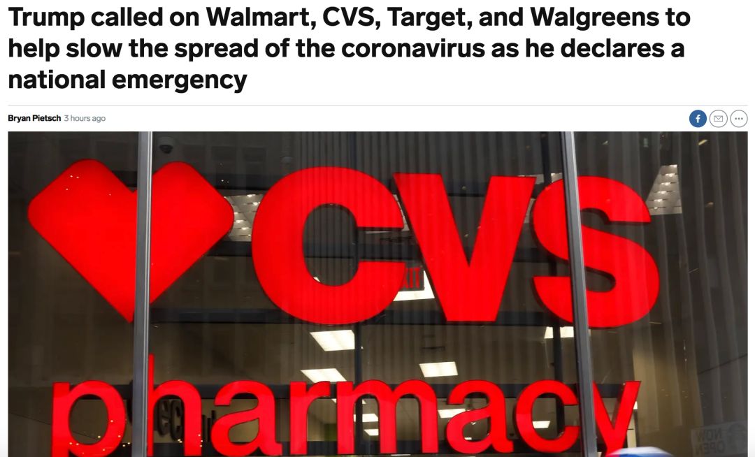 创建了Drive Through新冠检测体系。Walmart, Walgreens,CVS, Target等知名连锁便利店的CEO和川普一起站台,并保证在疫情期间这些人民刚需的商店不会关门本周起,将配合政府,在部分商店的停车场开设测试新冠的免下车测试点。