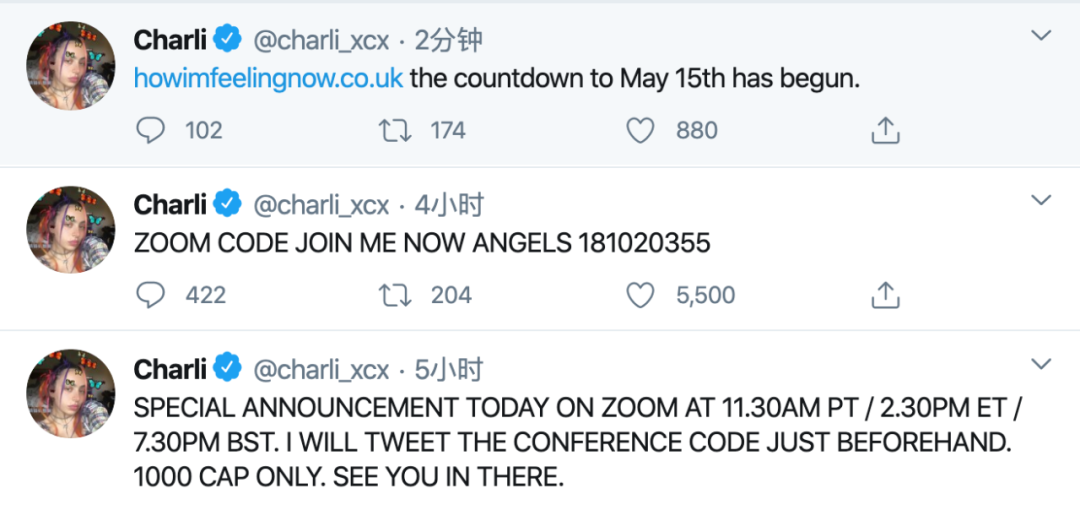 流行歌手Charli XCX也在Zoom上开了一场专辑发布和粉丝见面会,她在会前4小时发出了Zoom的视频编码,“人数限制1000人”,粉丝奔走相告。