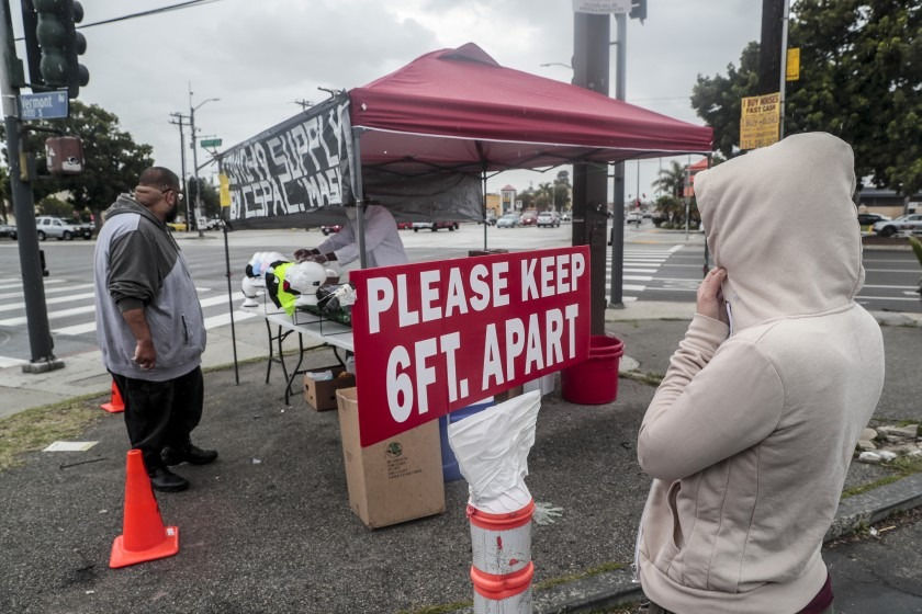 图片来自Los Angeles Times,版权归原作者当地官员同时提醒民众,戴口罩并不能取代“社交疏远”措施,在室外,人与人之间的距离必须严格遵守6英尺的相隔距离。