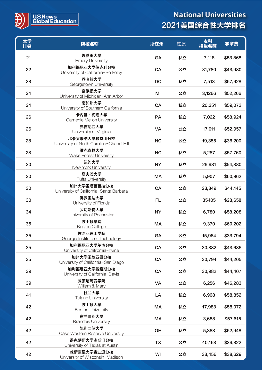 美国时间9月13日,世界最权威排名机构之一 U.S. News & World Report 《美国新闻与世界报道》(以下简称U.S. News)官方最新发布了2021年美国大学排名(2021 Best College Rankings)。