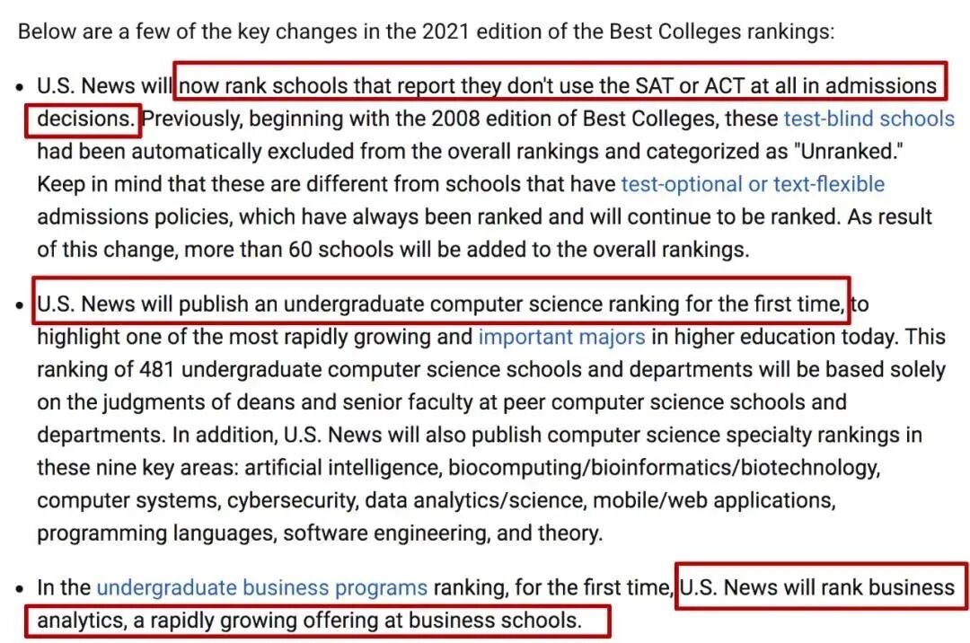 要知道,往年这些学校肯定是与U.S. News排名无缘的,很多不错的学校也就没有了登上权威榜单的曝光度,也正因此,之前有不少学校将“Test-Blind”改成了“test-optional”(可递交可不递交SAT/ACT成绩)。