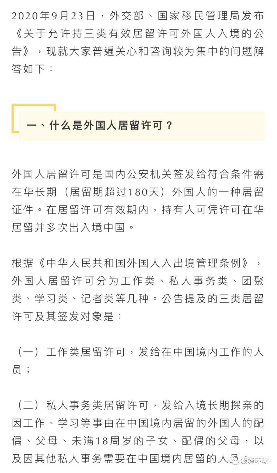 2020年9月23日,外交部、国家移民管理局发布《关于允许持三类有效居留许可外国人入境的公告》,现就大家普遍关心和咨询较为集中的问题解答如下: