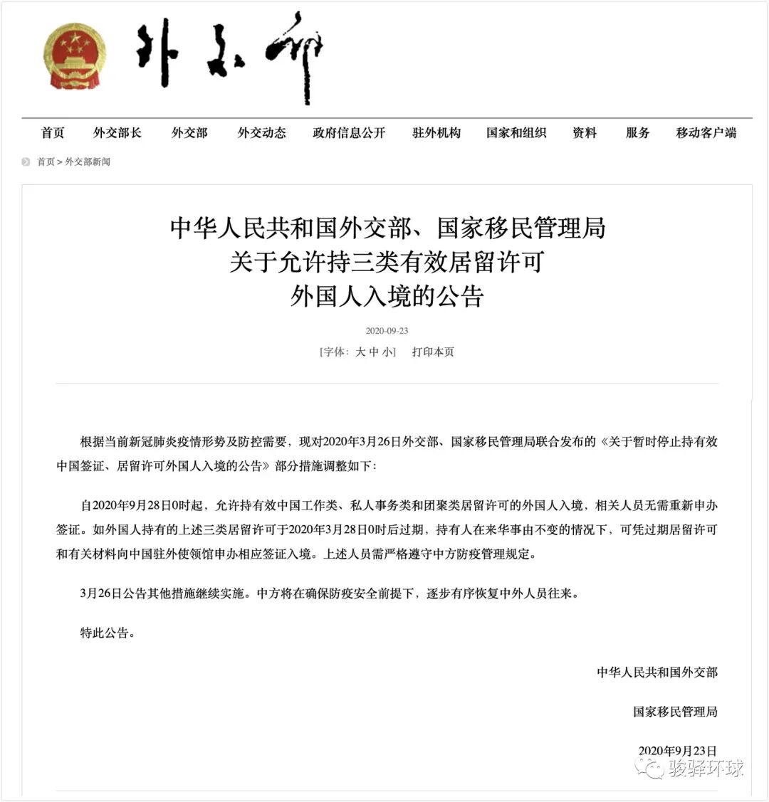 上周,中华人民共和国外交部和国家移民管理局对2020年3月26日发布的《关于暂时停止持有效中国签证、居留许可外国人入境的公告》部分措施进行了调整: