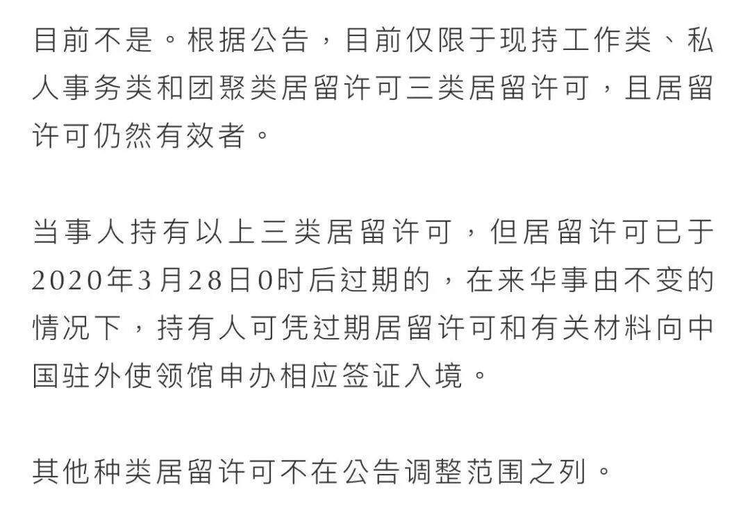 如外国人持有的上述三类居留许可于2020年3月28日0时后过期,持有人在来华事由不变的情况下,可凭过期居留许可和有关材料向中国驻外使领馆申办相应签证入境。