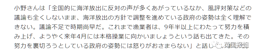 68岁的小野更是直言不讳:全国范围内反对海洋排放的呼声越来越高的情况下,政府没有讨论任何风评对策,就以“排入海洋”为前提进行工作。渔民们经过9年半的努力,终于在明年4月要正式开始捕鱼了,政府背叛了国民的努力,可不是做做思想工作就能平息愤怒的。